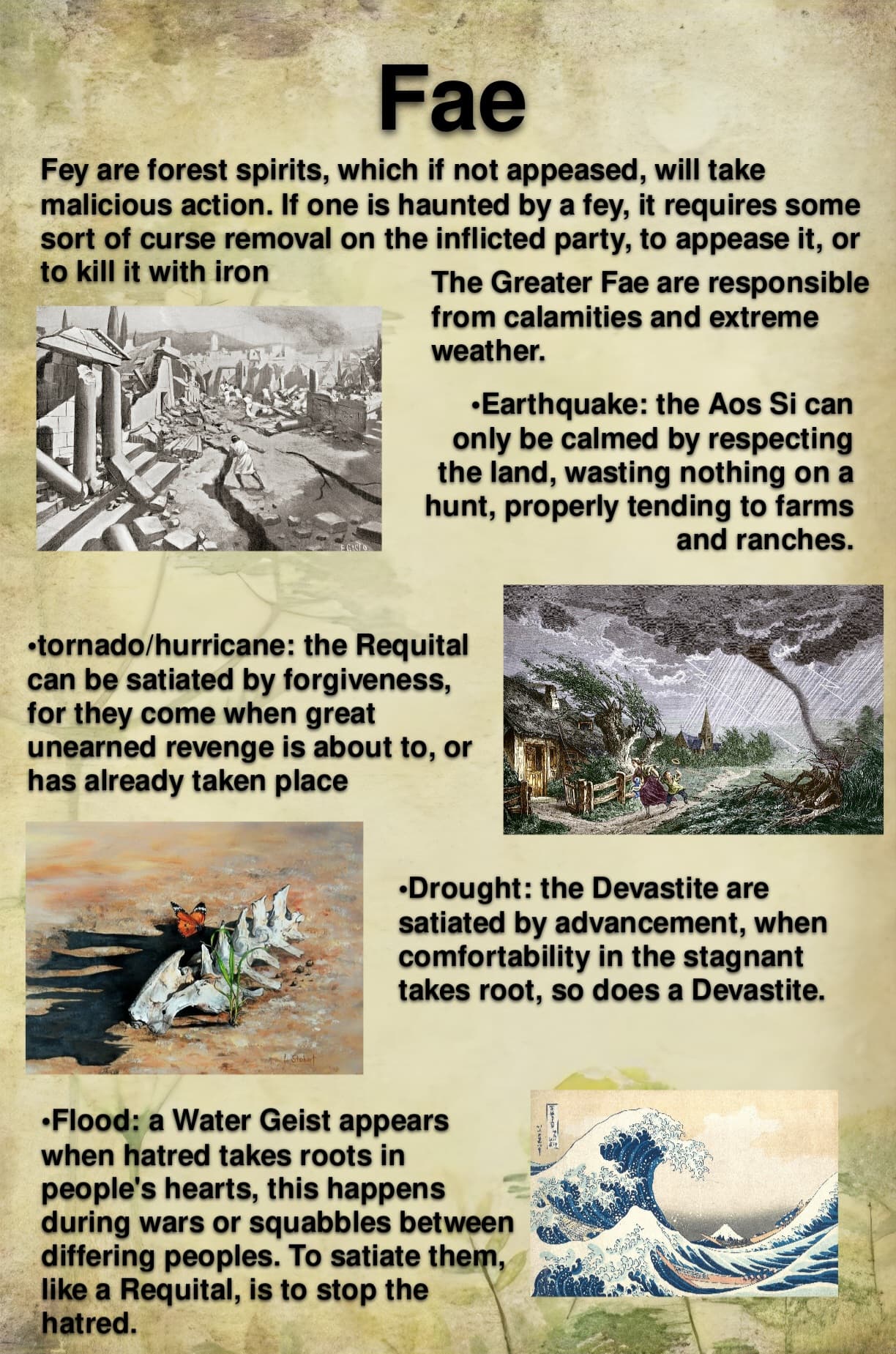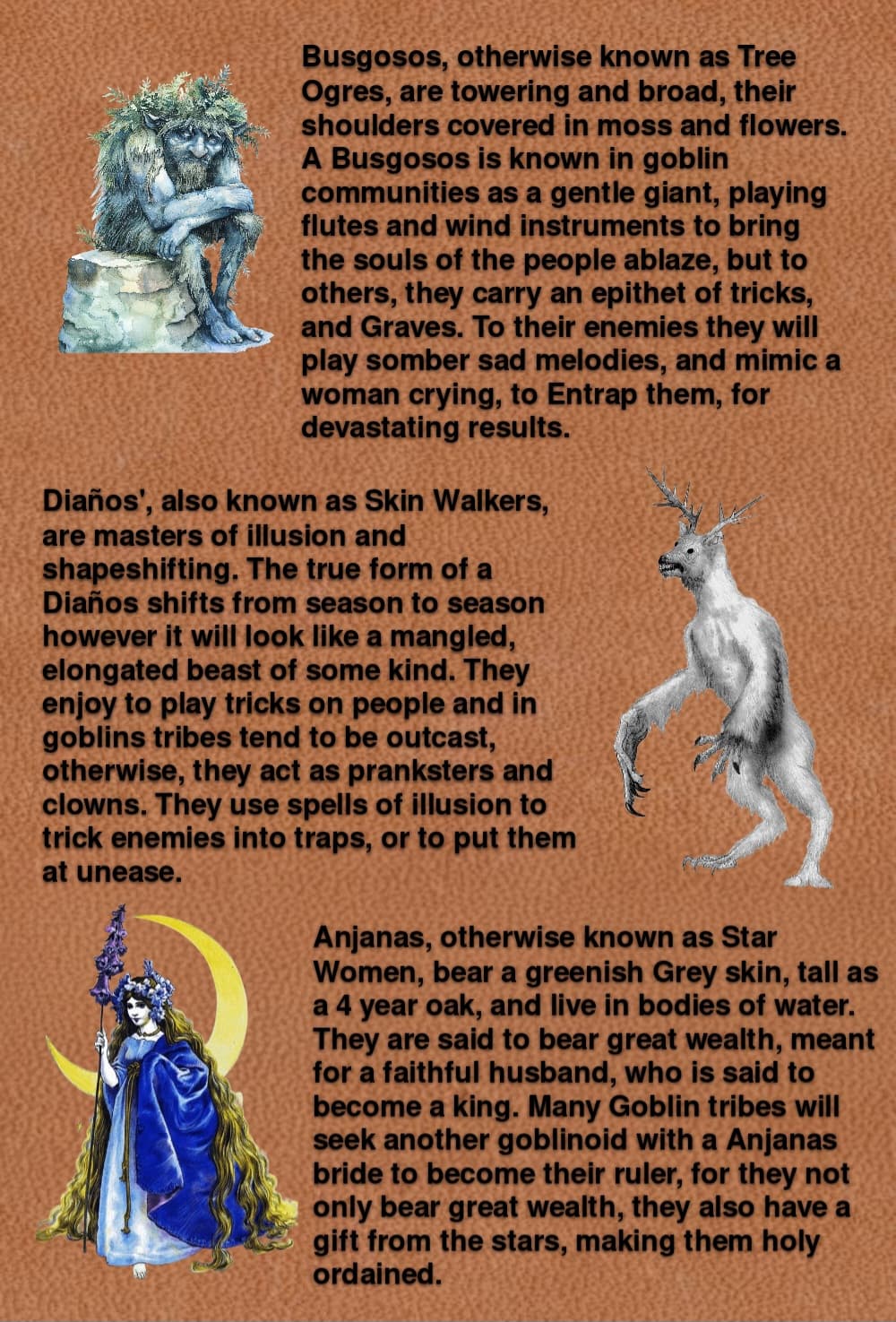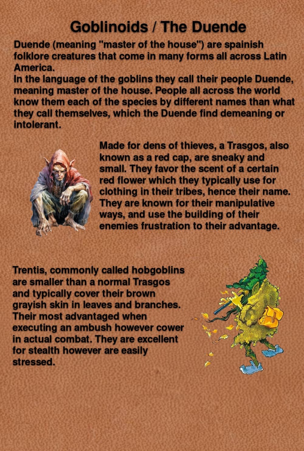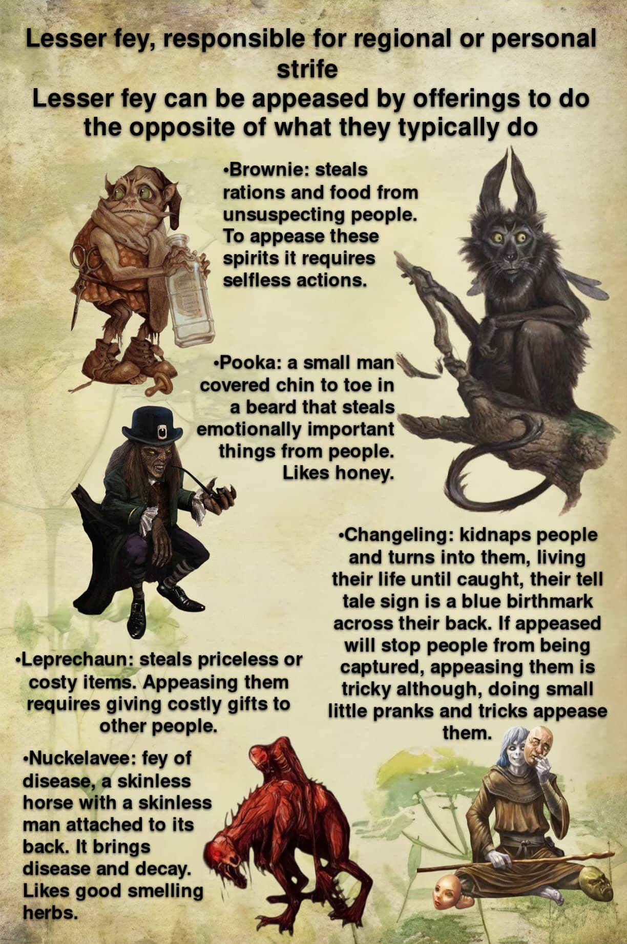 So I’ve posted my ideas for my witch, dragon, fiend, and genie reworks, and i got like 4 or 5 more i wanna work on, but since i aint posted anything anywhere in a while, here is my rework of fae, based on the definitions of fey being (marked by a foreboding of death or calamity, or quaintly unconventional, as found in the merriam webster dictionary), and my goblin rework, based off of spainish and south american Duendes.