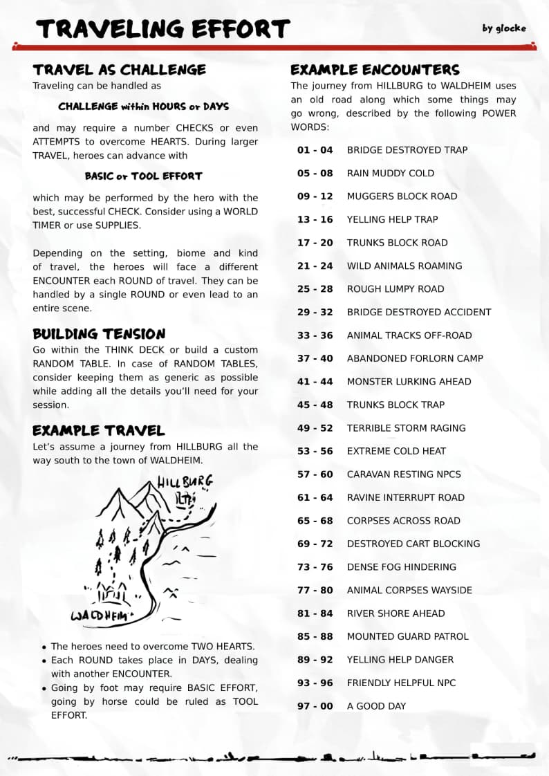 Hi Everyone! First post here! I’m running a gonzo game for my group and, due to being swept away to a random location, they now must travel back to the city where there next objective is. I don’t necessarily want to have travel be the whole part of the game. I really enjoy the skill challenge type rules for travel found here but I’m looking to adapt them to use effort or somethin similar. Does anyone have their own rules they like to use for travel? Thank you!