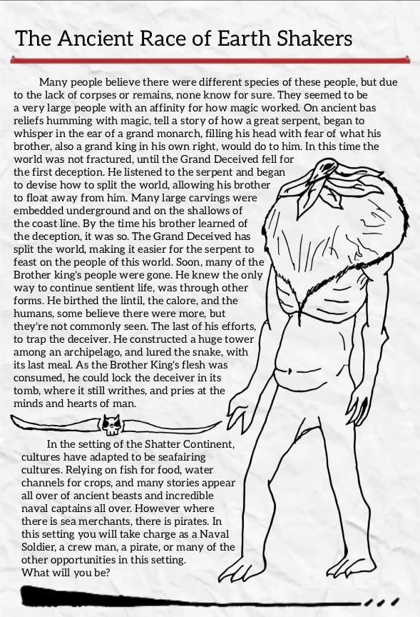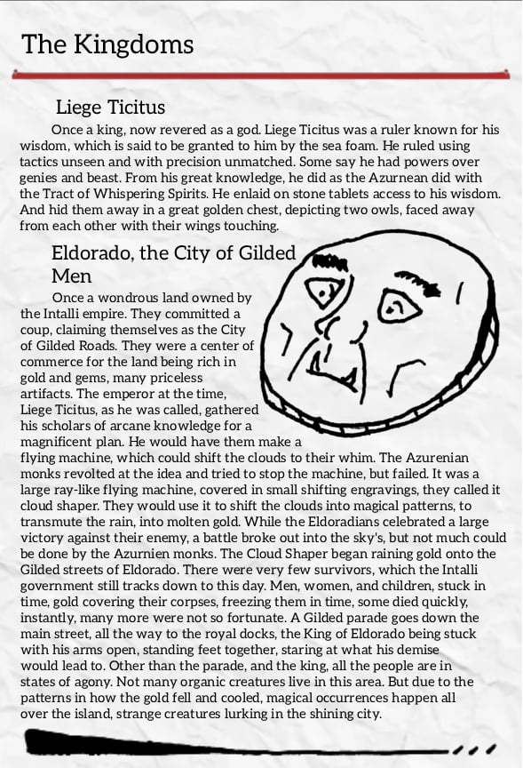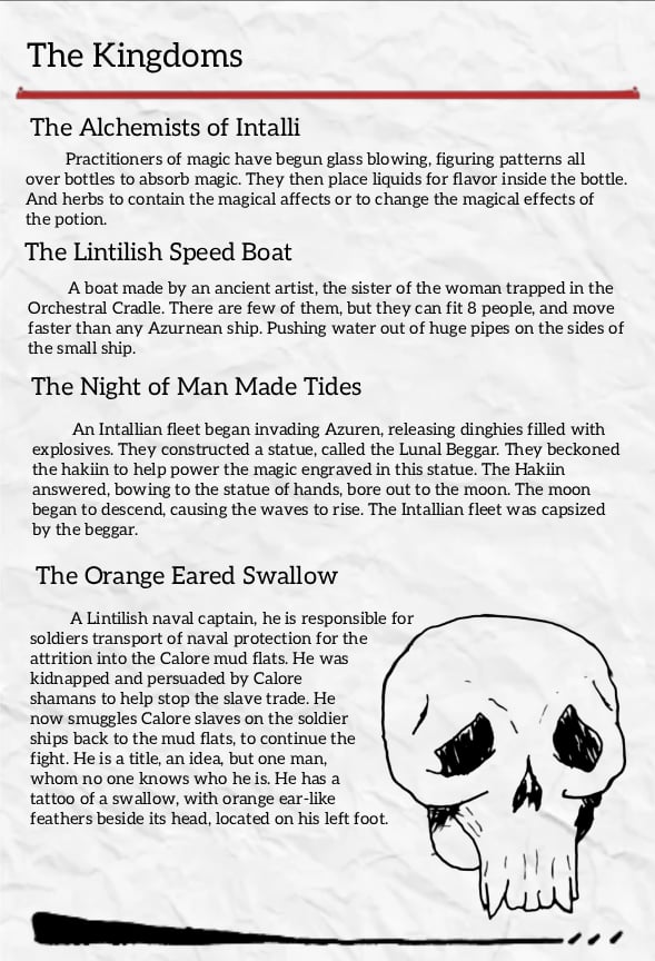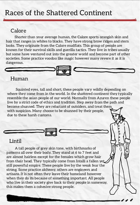 So I’ve posted my ttrpg Privateers, which in my opinion was a failed project. Well ive also posted my ideas on an ICRPG conversion, BECAUSE THE SETTING IS JUST SO COOL. And also who hasnt thought of a pirate campaign. So heres an update. I finally have found a descent editing program, and have been playing around with it, attatched is the details of the beginning of the setting, the races of the setting, as well as one of the 3 kingdoms, Intalli. Enjoy reading them, and remember, this is a test run of my editing skills, which are limited.