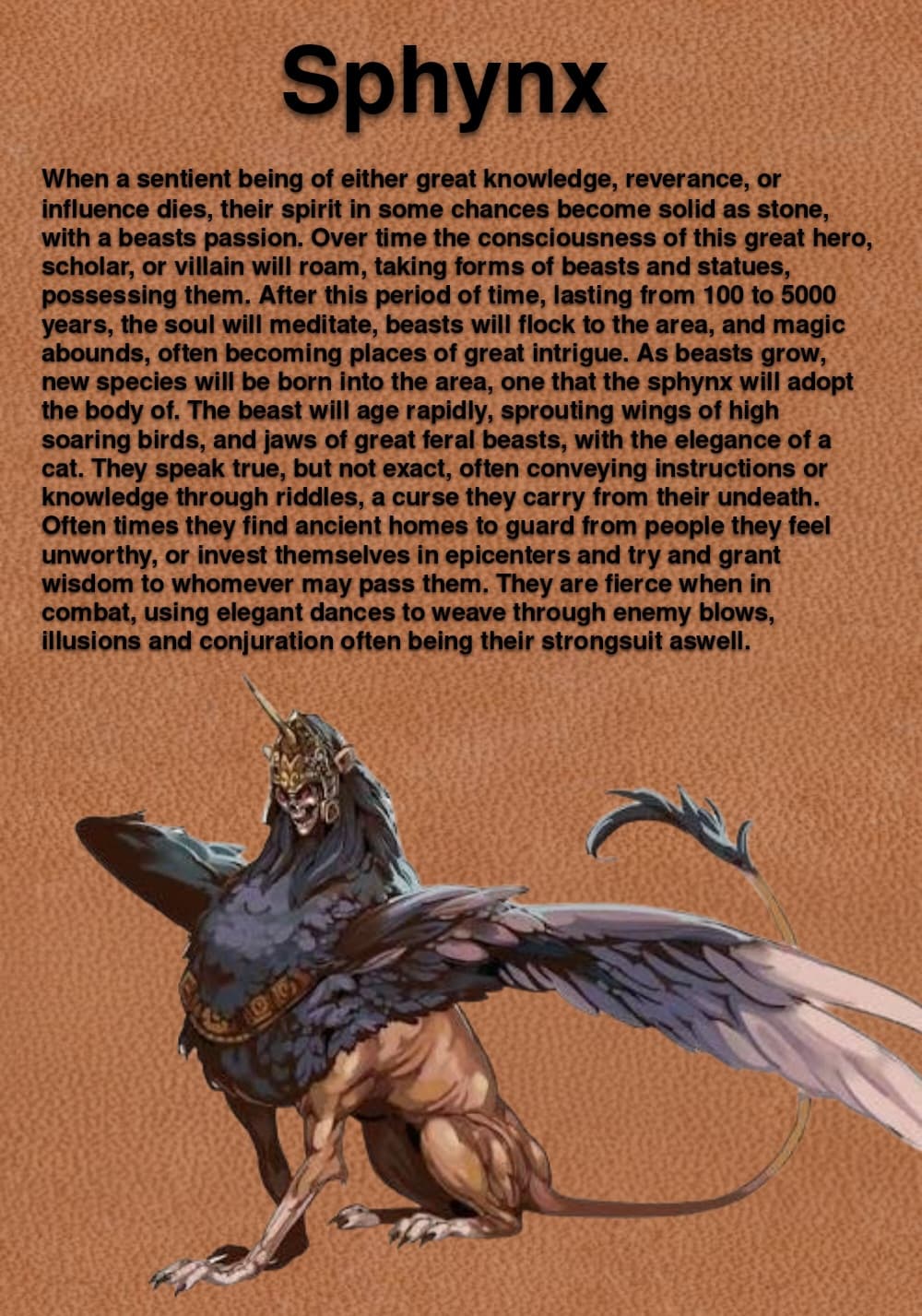 (Ps. Ive been working on this super cool world project called Alembic, finally i am distilling down all the things i love in fantasy, to one setting. Venture into Alembic, a world of fallen kings and false gods, explore the Halls of Dwarves, now over taken by the human race. Seek out the City of Transients and the petition the Coalition of Nomads for a boon. The setting of Alembic is one of nasty secrets, ancient lore, and hidden truths hid upon eons of deciet. Just message me or what have you if you want me to start posting it, im writing in the 5th era, which is kinda like, what i expect people would play in, the current era, but anyway, sphynxes.)